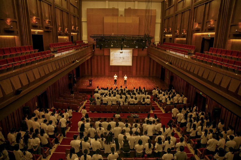 上图 来自声歌系大一年级的校史馆志愿者们上台,带领新生们高唱院歌