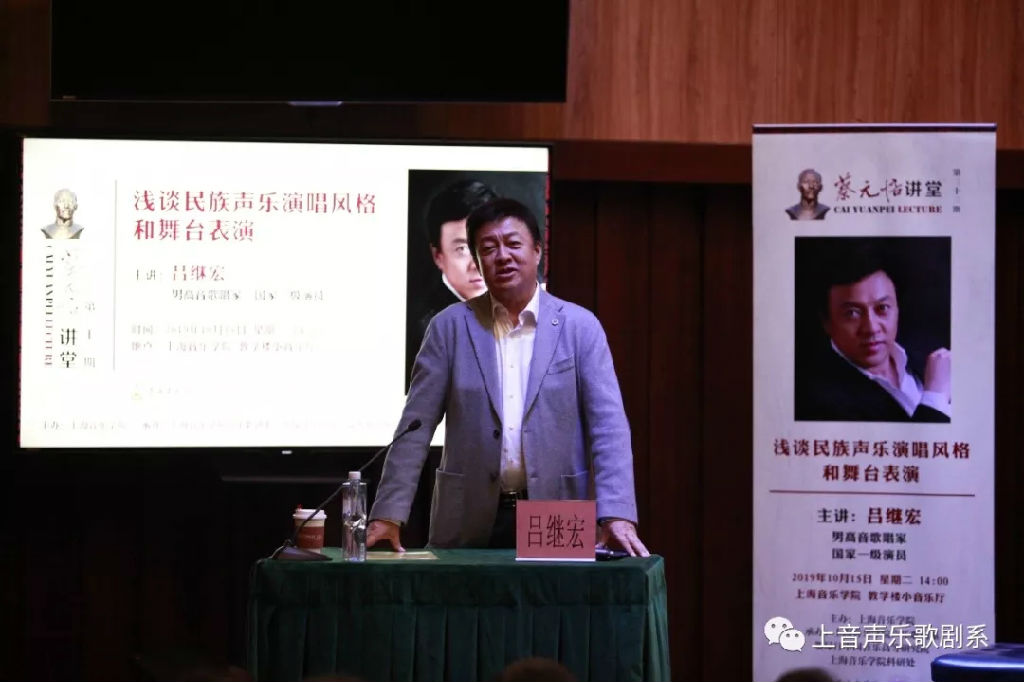 2019年10月15日下午,“蔡元培讲堂”第三十三期在上海音乐学院小音乐厅成功举办。本期讲堂邀请了我国著名男高音歌唱家、国家一级演员吕继宏教授进行题为《浅谈民族声乐演唱风格和舞台表演》的讲座,并对学生进行了现场教学指导。