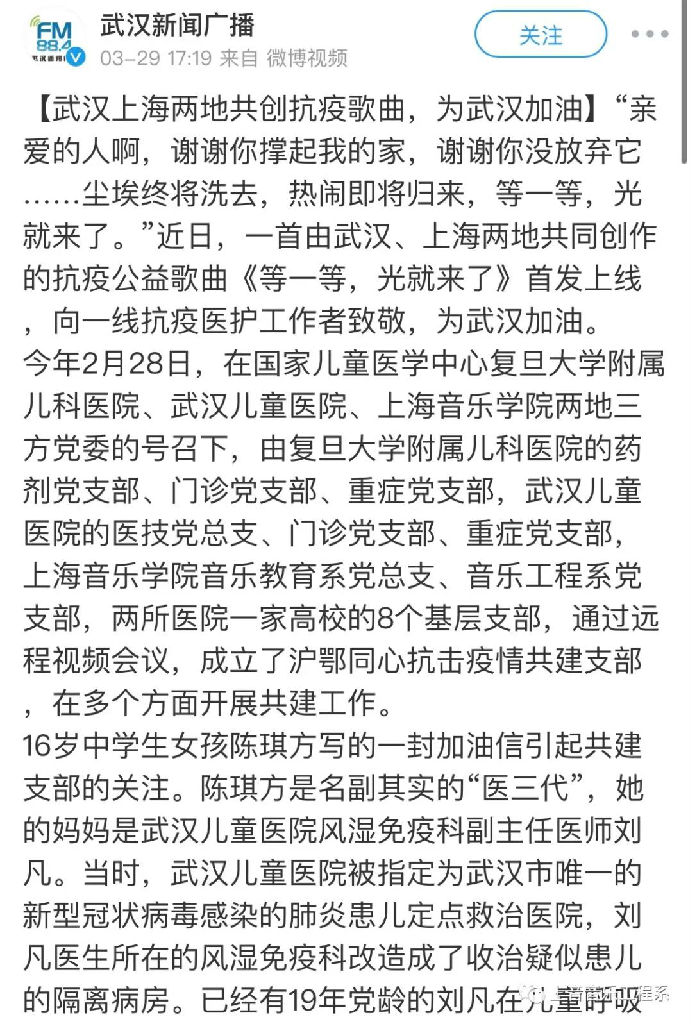 央视新闻再次对我院与复旦儿医、武汉儿童医院两地三方共建和我系创作歌曲进行了报道。自此曲推出后,不仅武汉、湖北、上海电台电视台等多家媒体进行了报道,并两次登上学习强国(湖北和上海平台),两度出镜央视新闻。正值武汉解禁,《等一等,光就来了》完美收官!