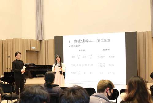 本次讲座内容郝老师主要分为三大板块进行了汇报。首先,通过对诠释一词的由来介绍以及诠释的目标阐述了“何为诠释”;随后又通过“世纪之交的协奏曲”、“结构与美学”、“复古风格演奏”三个主题对如何利用诠释学对莫扎特协奏曲进行审视并展开了探讨及演示。最后,由两位研究生同学:淮小璐和李承哲一同对莫扎特协奏曲K246的第二乐章进行了现场演奏与分析汇报。本次讲座亦是该课程《钢琴作品诠释学—钢琴协奏曲》的学期总结汇报,让同学们担任讲解,深度剖析了作品本身的结构和意义。