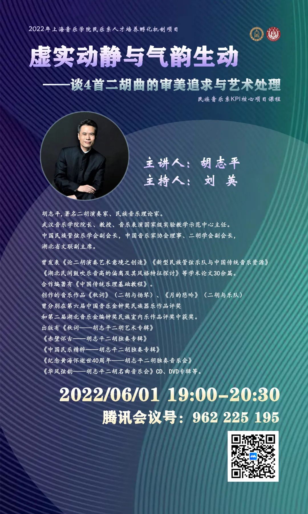 胡志平,著名二胡演奏家、民族音乐理论家。武汉音乐学院院长、教授、音乐表演国家级实验教学示范中心主任。中国民族管弦乐学会副会长,中国音乐家协会理事、二胡学会副会长,湖北省文联副主席。