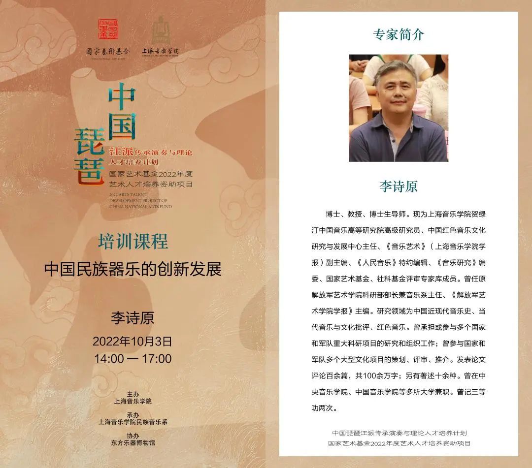 “十一”小长假的第三天,由国家艺术基金资助,以上海音乐学院为实施单位的公益性培训——“中国琵琶汪派演奏与理论人才培养计划”项目,于下午2点,在线上迎来了本次活动的第一场讲座。本次讲座的主题为《中国民族器乐的创新发展》,由上海音乐学院贺绿汀中国音乐高等研究院高级研究员、中国红色音乐文化研究与发展中心主任、《音乐艺术》(上海音乐学院学报)副主编李诗原教授主讲,上海音乐学院民乐系汤晓风副教授担任主持。