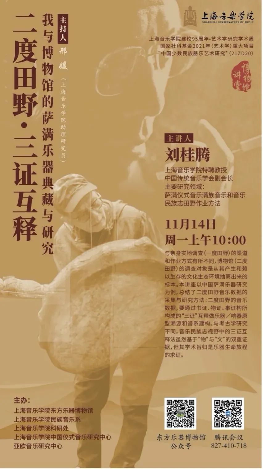 本讲座以中国萨满乐器研究为例,总结了二度田野音乐数据的采集与研究方法:二度田野的音乐数据,要通过书证、物证、事证构所构成的“三证”互释做乐器/响器原型溯源和谱系建构。与考古学研究不同,音乐民族志视野中的三证互释法虽然基于“物”与“文”的双重证据,但其学术旨归是乐器生命旅程的求证。