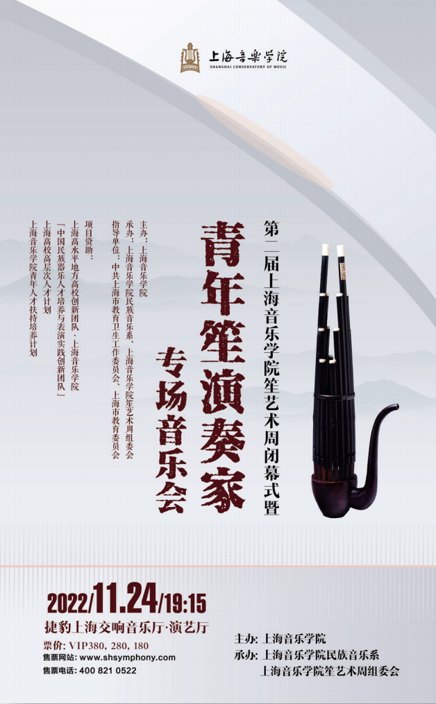 因上海疫情防控要求,原定于11月24日的第二届上音笙艺术周闭幕式暨青年笙演奏家音乐会将改为线上展播,播出时间另行通知。当代笙演奏艺术与创作学术高峰论坛 II 也将于线上如期举行。感谢各位的理解和支持。