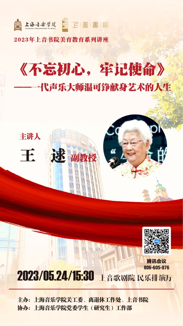 为深入开展学习贯彻习近平新时代中国特色社会主义思想主题教育,落实立德树人的根本任务,充分发挥老专家、老教师的教育引导和关爱青年教师和学生健康成长的优势作用,2023年5月24日下午,由上海音乐学院关工委、离退休工作处和上音书院共同主办、上海音乐学院党委学生(研究生)工作部协办的《不忘初心,牢记使命----一代声乐大师温可铮献身艺术的人生》的主题讲座采用线上线下相结合的方式进行。讲座由温可铮夫人、上海音乐学院离退休教师宣讲团成员、原声乐系副教授王逑主讲。她还是上海市欧美同学会的艺术总监和钢琴伴奏,曾获评2019年度静安区十大公共文化旅游人物(大爱传播艺术)。
