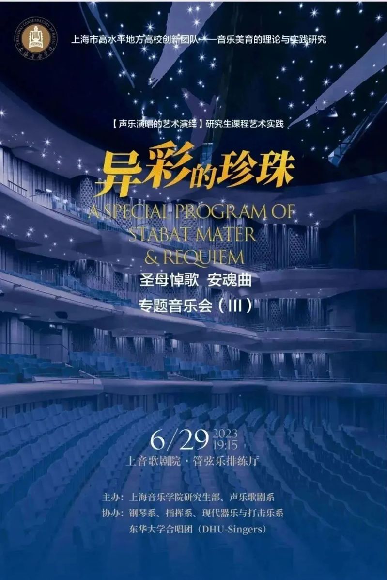 6月29日,由上海音乐学院研究生部、声乐歌剧系主办,钢琴系、指挥系、现打系、东华大学合唱团协办,上音博士生导师葛毅教授担任艺术总监的【声乐演唱的艺术演绎】研究生课程艺术实践,在系领导的支持与各系的热情参与下,“异彩的珍珠”专题音乐会(Ⅲ)于上音歌剧院管弦排练厅演出圆满成功。