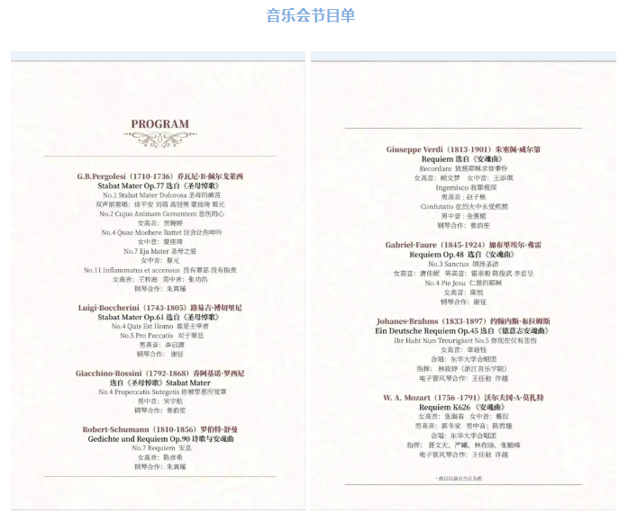 当晚音乐会涵盖了从巴洛克时期的佩尔戈莱西 G.B.Pergolesi (1710-1736)到后浪漫主义时期的弗雷 G.Fauré (1845-1924)等九位作曲家的经典作品,由2022级硕博研究生以独唱、重唱和合唱形式呈现。学生们通过与钢琴的合作,提高专业演唱的综合能力。音乐会同时有上音指挥系、现代器乐与打击乐系、东华大学合唱团( DHU Singers )参与制作,为学生们创造更为真实贴切的艺术实践舞台,激发和丰富学生们演唱的感染力,从而达到教学目标。