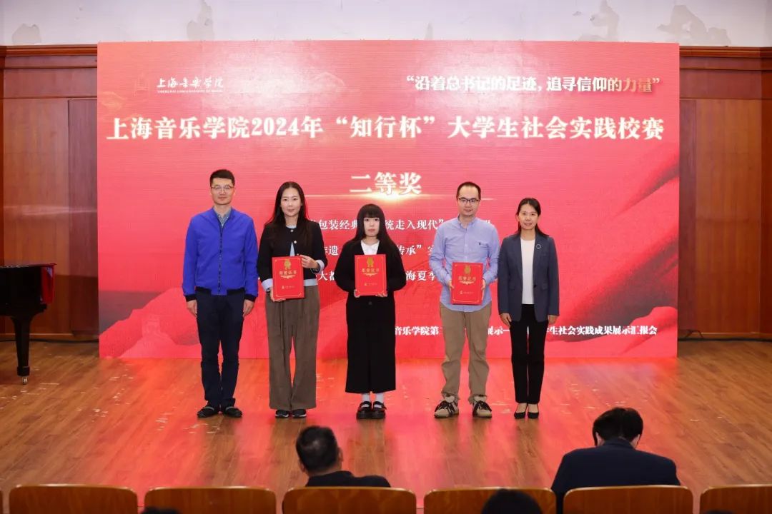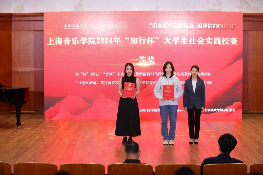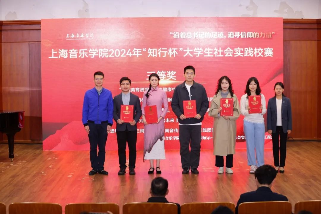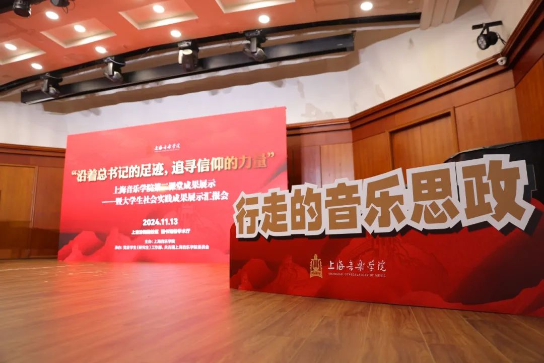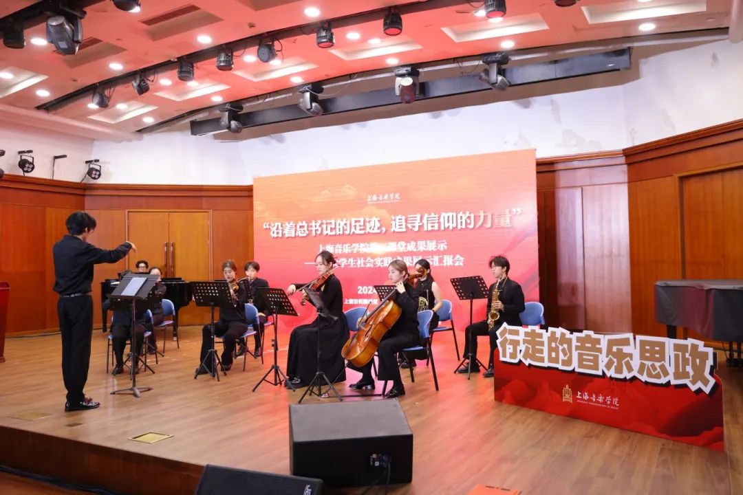 为全面贯彻党的二十大和二十届二中、三中全会精神,坚持不懈用习近平新时代中国特色社会主义思想铸魂育人,党委学生(研究生)工作部、团委联合各社会实践团队近日在淮海路校区图书馆楼学术厅组织举办“沿着总书记的足迹,追寻信仰的力量”上海音乐学院第二课堂成果展示——暨大学生社会实践成果展示汇报会。 社会实践成果分享展览于图书馆长廊展出。依托“行走的音乐思政”开展追寻习近平总书记的足迹,开展社会调研与社会服务活动。党委副书记、副院长徐卫,各院系、团队师生代表出席本次活动。汇报会由音乐戏剧系王梓主持。 徐卫讲到,今年共申报16个项目,参与师生近300余人。师生们实践地涉及新疆、内蒙古、浙江、贵州、陕西等地,深入开展社会服务和社会调查。希望同学们将暑期实践意义延伸至学习生活,扎根大地了解国情民情,以青春为时代助力。 党委学生(研究生)工作部部长、学生处处长欧阳佳沁、团委书记、党委学工部副部长马杰,为获得上音2024年“知行杯”大学生社会实践校赛的同学们颁奖。 随后,各院系代表展示其暑期社会实践成果。艺术管理系团队代表成啸宣讲《产学研融合培养体系,助力亚洲演艺之都建设》;数字媒体艺术学院团队代表秦艺萱、杨小晞、汤依憬同学宣讲《向“新”而行,“音 画”未来——文化赋能新时代西部大开发的实践探索》,并由吴涵琪演奏钢琴作品;音乐教育系团队代表李逸飞宣讲《实施美育浸润,助力健康中国》;音乐学系团队代表张晓萱宣讲《非遗寻根文脉传承——音乐非遗铸牢中华民族共同体意识》。 此外,音乐戏剧系团队同学带来音乐剧选段《追寻》福兴布庄片段;管弦系团队同学演绎原创组歌《转战陕北组曲》;声乐歌剧系团队同学演唱歌曲《领航》。