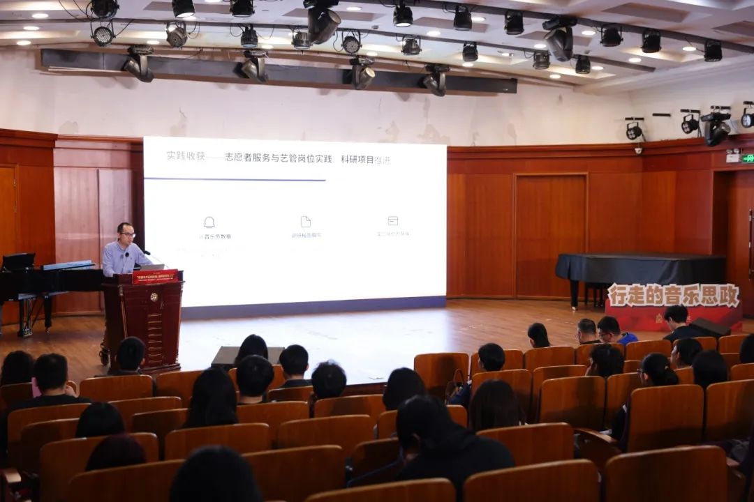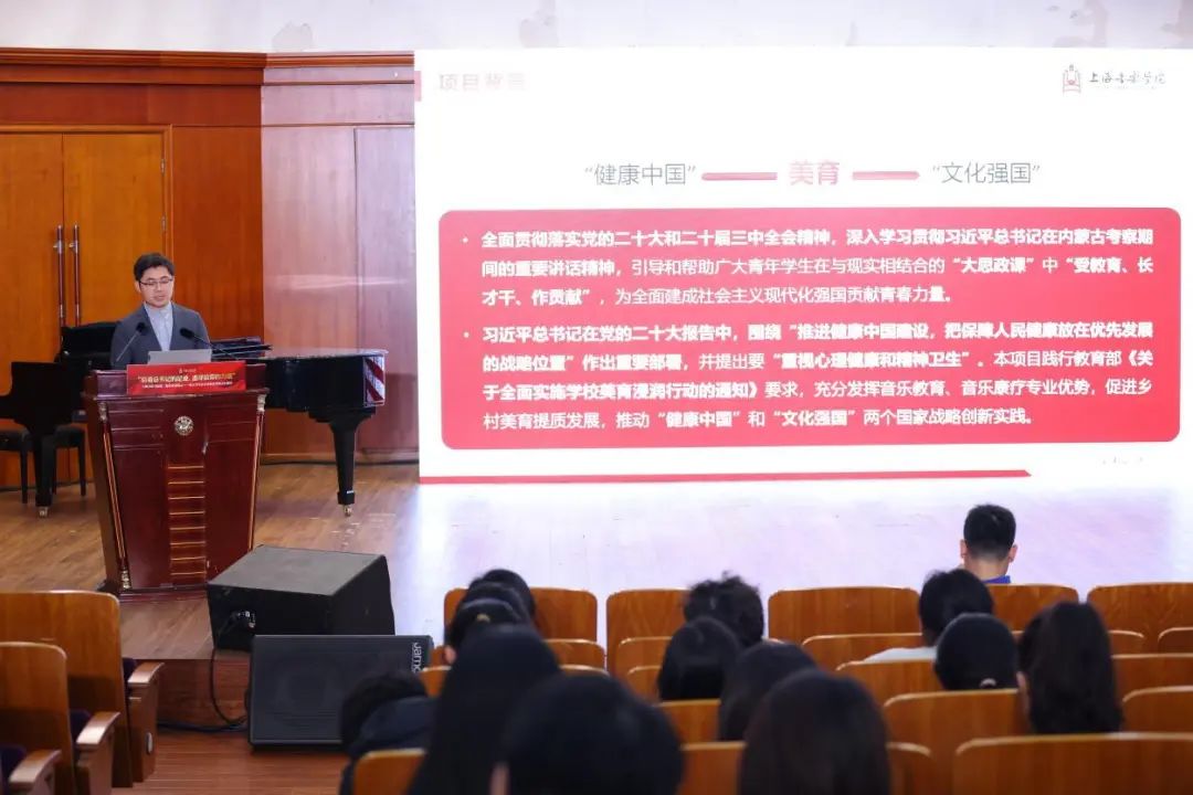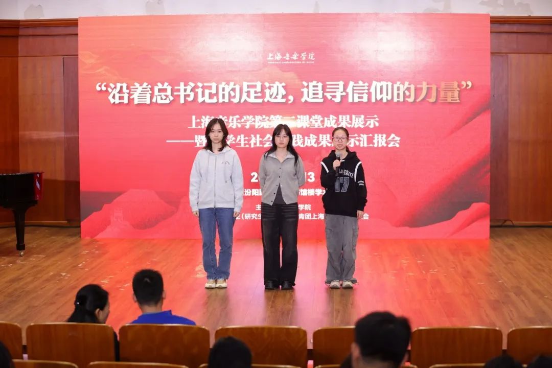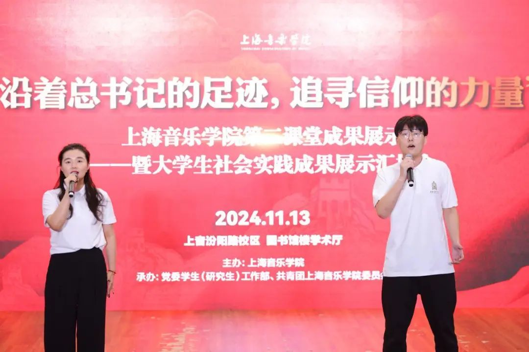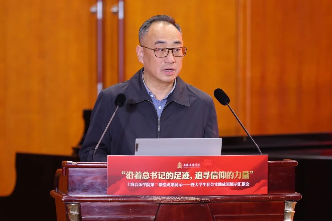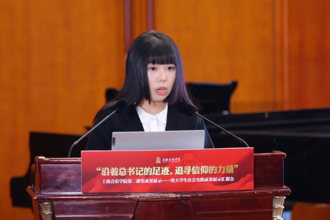 为全面贯彻党的二十大和二十届二中、三中全会精神,坚持不懈用习近平新时代中国特色社会主义思想铸魂育人,党委学生(研究生)工作部、团委联合各社会实践团队近日在淮海路校区图书馆楼学术厅组织举办“沿着总书记的足迹,追寻信仰的力量”上海音乐学院第二课堂成果展示——暨大学生社会实践成果展示汇报会。 社会实践成果分享展览于图书馆长廊展出。依托“行走的音乐思政”开展追寻习近平总书记的足迹,开展社会调研与社会服务活动。党委副书记、副院长徐卫,各院系、团队师生代表出席本次活动。汇报会由音乐戏剧系王梓主持。 徐卫讲到,今年共申报16个项目,参与师生近300余人。师生们实践地涉及新疆、内蒙古、浙江、贵州、陕西等地,深入开展社会服务和社会调查。希望同学们将暑期实践意义延伸至学习生活,扎根大地了解国情民情,以青春为时代助力。 党委学生(研究生)工作部部长、学生处处长欧阳佳沁、团委书记、党委学工部副部长马杰,为获得上音2024年“知行杯”大学生社会实践校赛的同学们颁奖。 随后,各院系代表展示其暑期社会实践成果。艺术管理系团队代表成啸宣讲《产学研融合培养体系,助力亚洲演艺之都建设》;数字媒体艺术学院团队代表秦艺萱、杨小晞、汤依憬同学宣讲《向“新”而行,“音 画”未来——文化赋能新时代西部大开发的实践探索》,并由吴涵琪演奏钢琴作品;音乐教育系团队代表李逸飞宣讲《实施美育浸润,助力健康中国》;音乐学系团队代表张晓萱宣讲《非遗寻根文脉传承——音乐非遗铸牢中华民族共同体意识》。 此外,音乐戏剧系团队同学带来音乐剧选段《追寻》福兴布庄片段;管弦系团队同学演绎原创组歌《转战陕北组曲》;声乐歌剧系团队同学演唱歌曲《领航》。