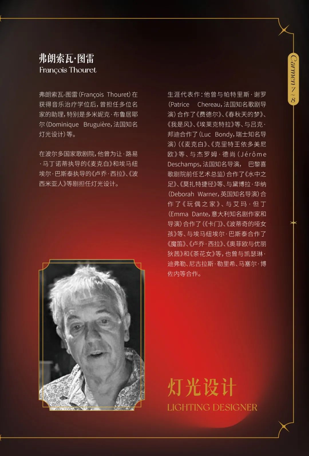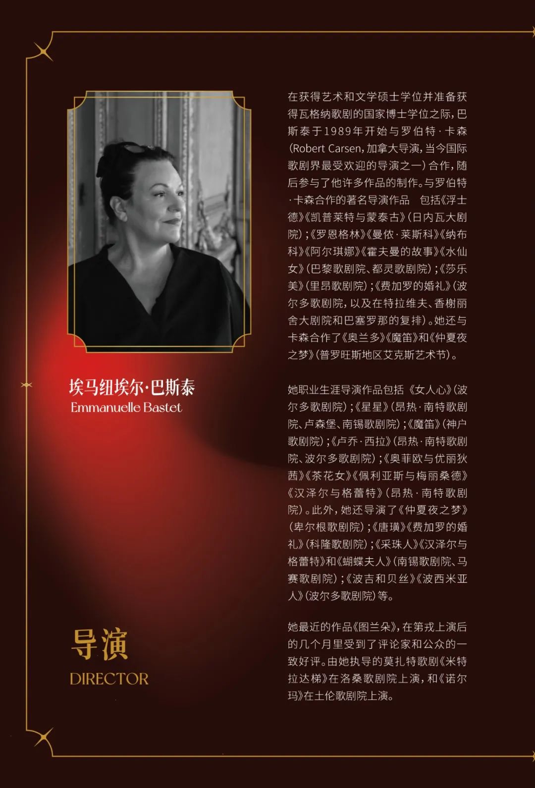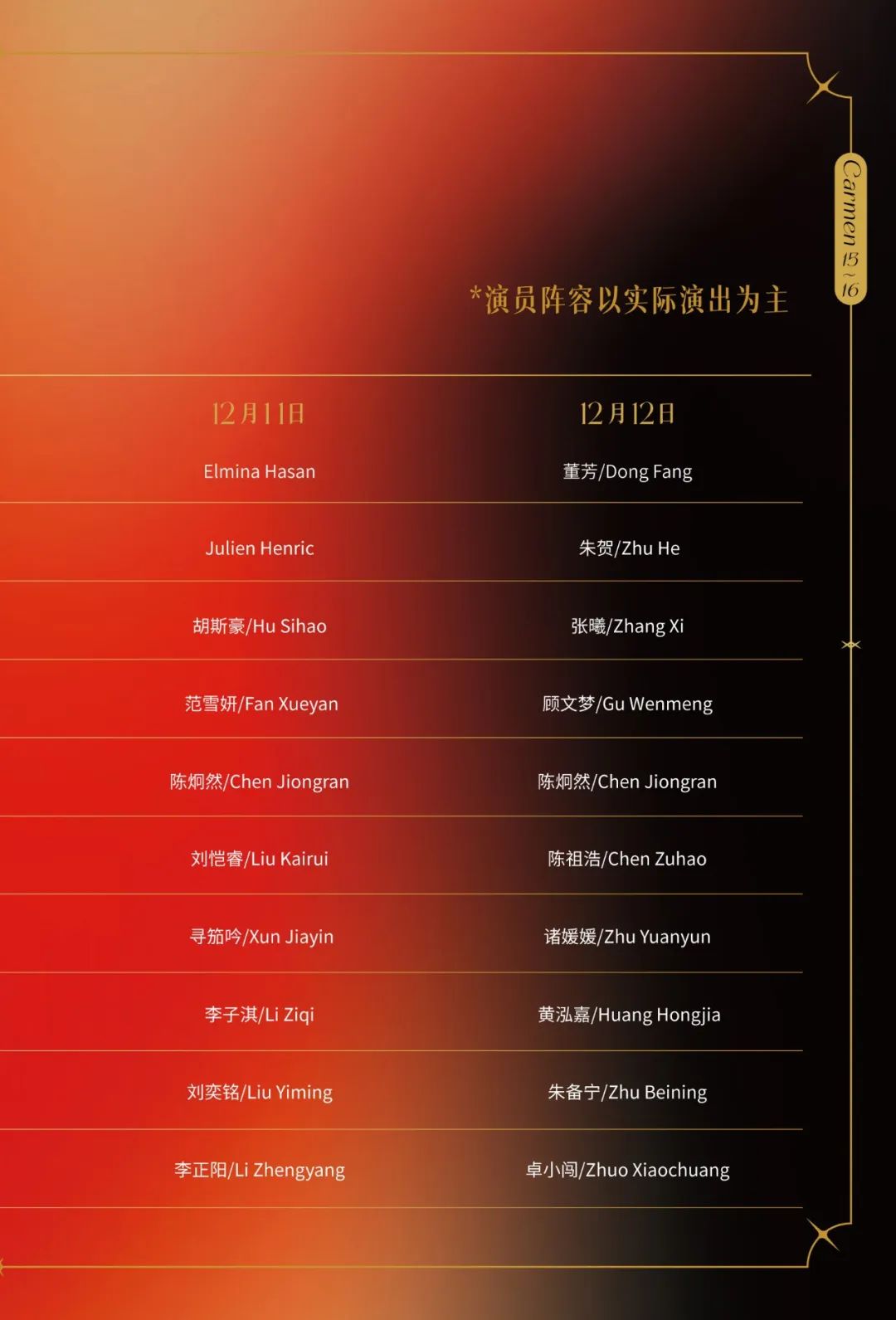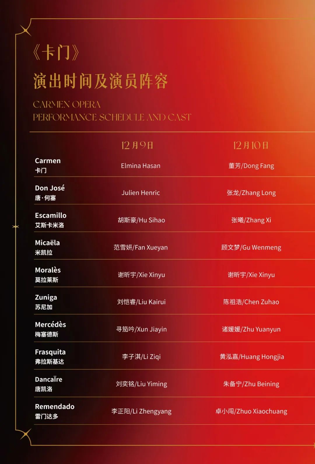 在这部经典歌剧问世即将150周年之际,此次中法联合制作的“上音版”,集结了上音歌剧院与波尔多国家歌剧院的中法两国艺术家团队,由上海音乐学院院长、上音歌剧院院长廖昌永教授和法国波尔多国家歌剧院院长艾曼纽尔·翁德雷(Emmanuel Hondré)担任艺术总监,特邀法国波尔多国家歌剧院主创团队参与到此版《卡门》的歌剧制作,其中埃马纽埃尔·巴斯泰(Emmanuelle Bastet)担任导演,舞美设计、灯光设计和服装设计分别为:蒂姆·诺瑟姆(Tim Northam)、弗朗索瓦·图雷(François Thouret)和维罗妮卡·赛玛(Véronique Seymat)。主要演员是来自上海音乐学院青年歌剧团才华横溢的青年才俊们,更有两位外籍歌剧新秀艾尔米那·哈桑(Elmina Hasan,获得2024年多明戈世界歌剧大赛二等奖)和朱利安·亨利克(Julien Henric)饰演男女主角亮相申城,上音版卡司由董芳饰演卡门,张龙饰演唐何塞,同样精彩值得期待。指挥家林大叶执棒上海音乐学院交响乐团,上海音乐学院合唱团担任合唱,Sfuture艺术团担任少儿合唱。