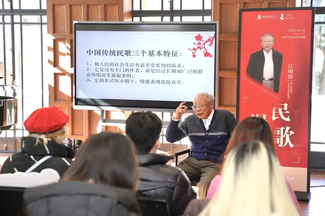 2025年1月1日上午10:00,“蔡元培美育大讲堂”迎来新年第一讲。“民歌《茉莉花》有100多种版本,西方歌剧《图兰朵》和经典曲《回家》都有它的身影,”中国著名民族音乐学者、上海音乐学院前院长江明惇教授以《民歌漫议》为题,边讲边唱,为市民和观众带来了一场充满民族风情的音乐盛宴,他幽默地阐述了中国民歌的地位,“曾有人说民间文化是母亲,文人创作是父亲,但是,父亲也是母亲生的啊!”