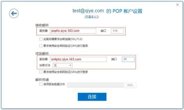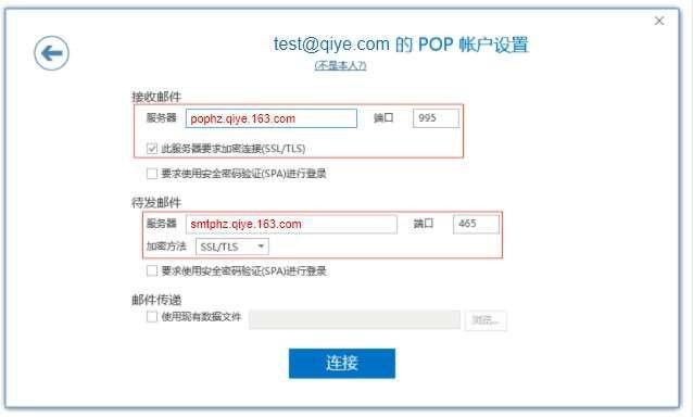 第四步:输入帐号密码和服务器地址信息,点击连接。建议使用SSL加密设置,邮件收发更安全。