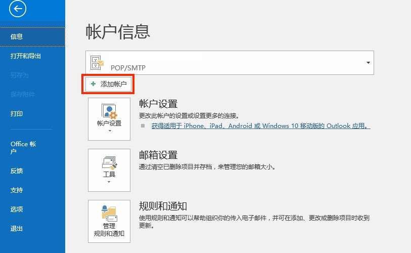 第一步:启动 outlook2016,选择文件-信息-添加帐户。