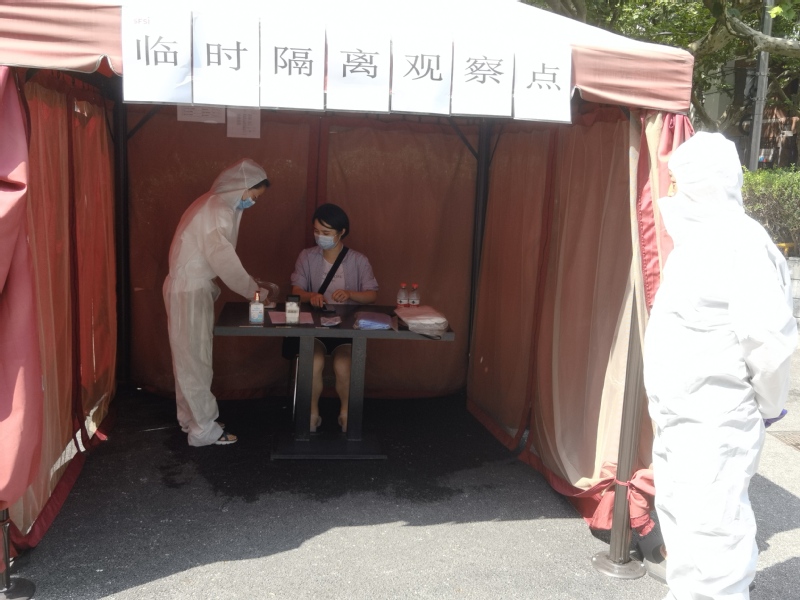 随后,在零陵路校区门口处进行了校门管理和应急处置演练,模拟学生集中报到场景:包括正常入校、身份识别错误和校医对体温异常的学生进行处置、完善上报流程并进行现场消杀。