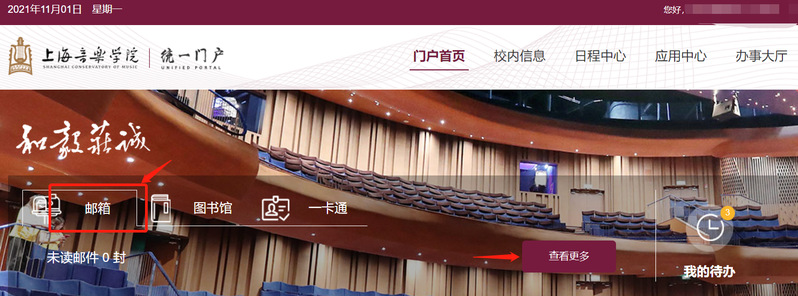 2. 校园统一门户:https://ishcm.shcmusic.edu.cn/。当个人邮箱开通后,也可点击页面中“邮箱”下“查看更多”图标,通过统一身份认证单点登录进入邮件系统。