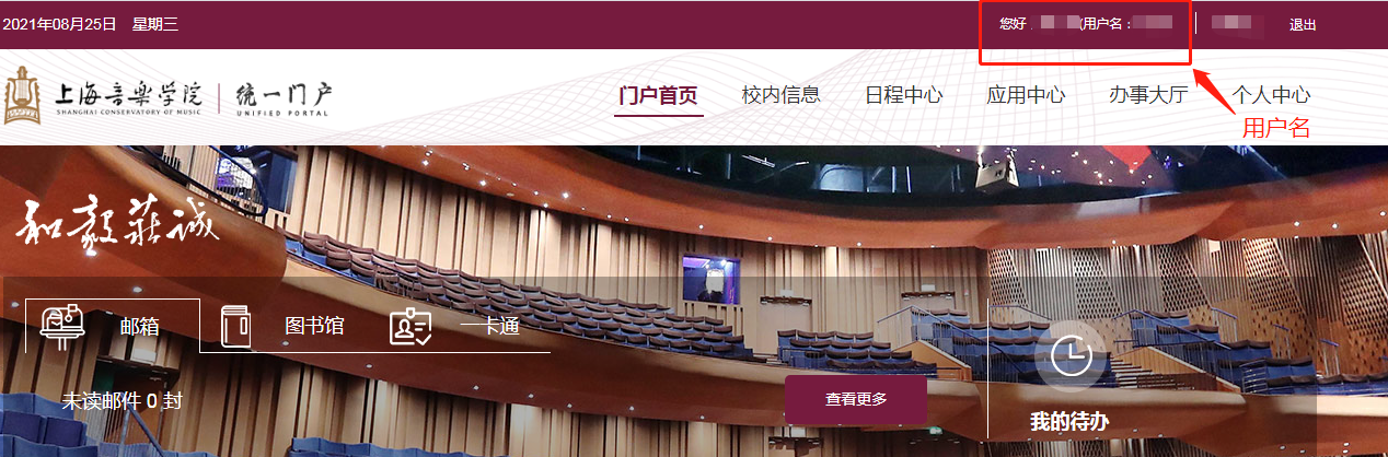统一身份认证用户名为激活时用户自行设置。如不记得用户名,可使用学工号登陆统一门户,查看右上角提示: