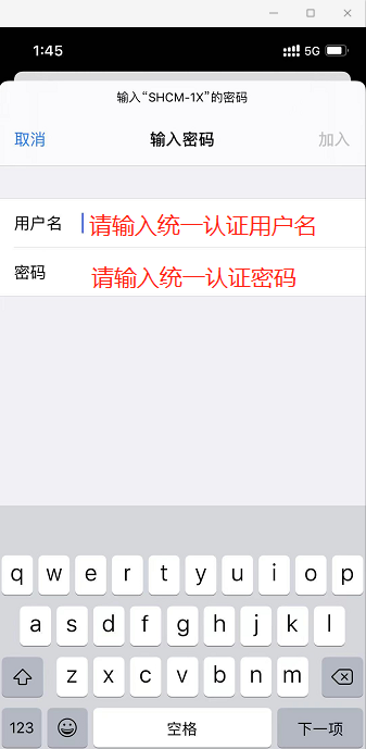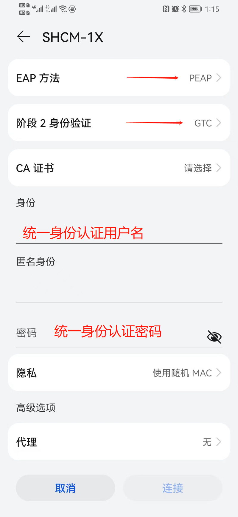 连接到SHCM-1X无线信号,会自动跳出以下登陆框。请输入统一身份认证用户名和密码。图左为苹果系统,图右为安卓系统,安卓系统的CA证书,请选择“无证书”: